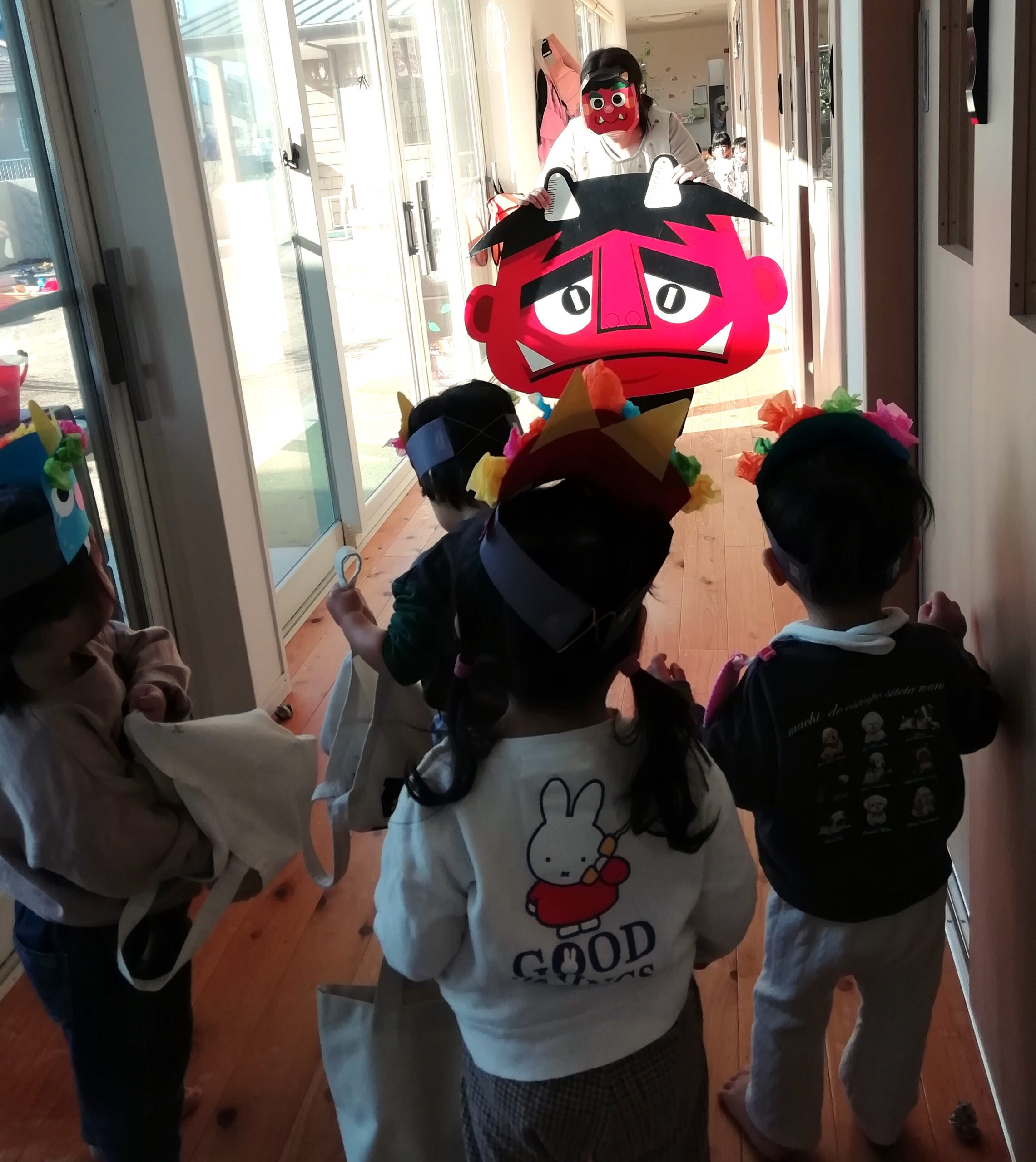 本日は節分!ハッピーランドにも鬼がやってきました! みんなで鬼退治~👹豆まきをして、鬼を追い出しました😊 鬼はそと~!福はうち~!元気な声で伝統行事を楽しみました🥰